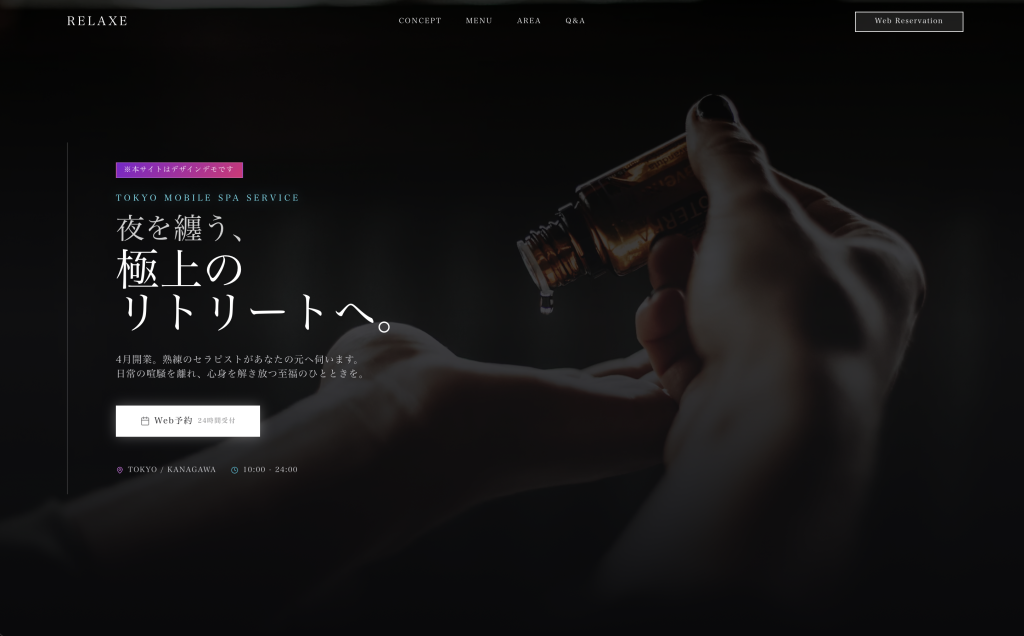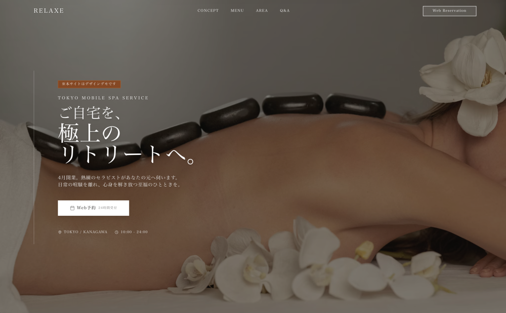 【デモサイト】RELAXE | 東京・神奈川の出張マッサージ RELAXE Concept Menu Area Q&A Web Reservation トップ コンセプト コース・料金 出張エリア よくある質問 03-0000-0000 受付 10:00〜23:00 ※本サイトはデザインデモです Tokyo Mobile Spa Service ...