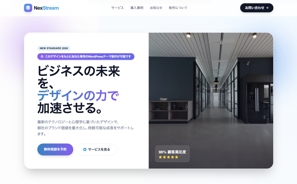 ワードプレスオリジナルテーマ作成・開発デモ | NexStream - 2026年最新デザイン NexStream サービス 導入事例 お知らせ 制作について お問い合わせ サービス 導入事例 お知らせ 制作について 店舗情報 お問い合わせ NEW STANDARD 2026 このデザインをもと... -